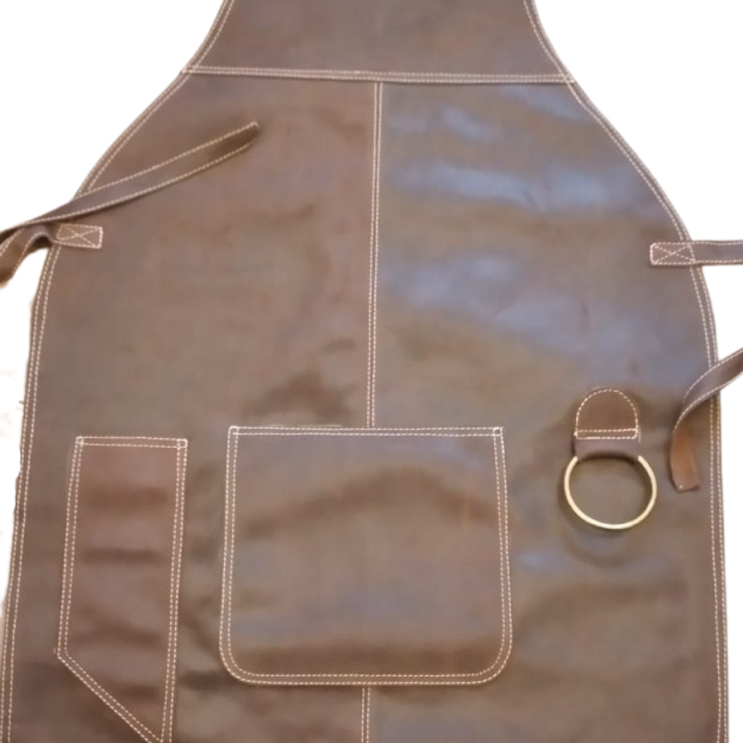 Pechera de Cuero Encerado café reforzadas con doble costura, con bolsillo multiuso, porta cuchillo, regulable en el cuello, argolla de bronce y , medidas 47 x 72 cm. Este producto se puede grabar con el nombre, logo o alguna reseña